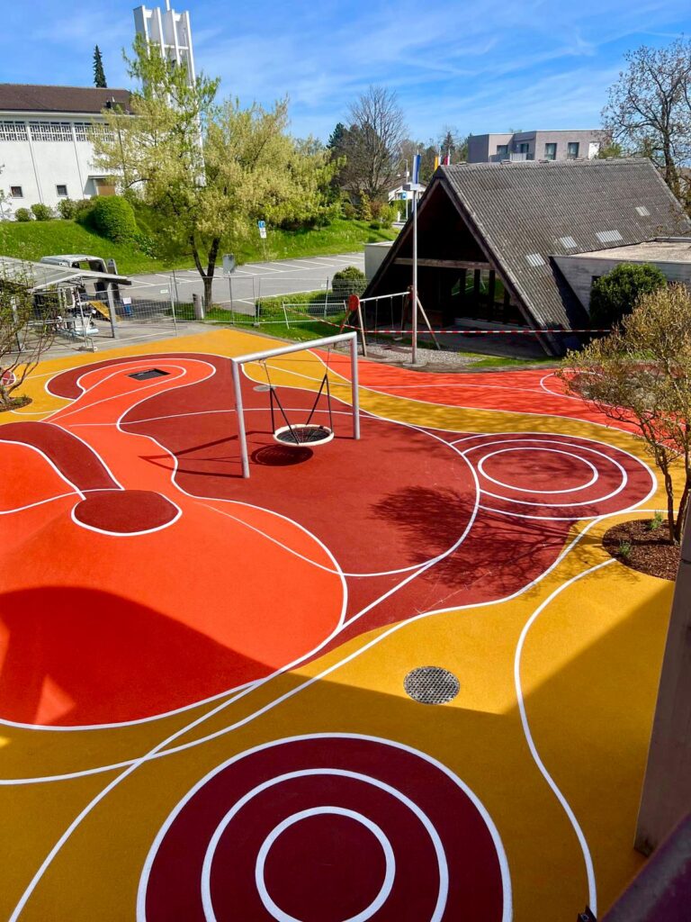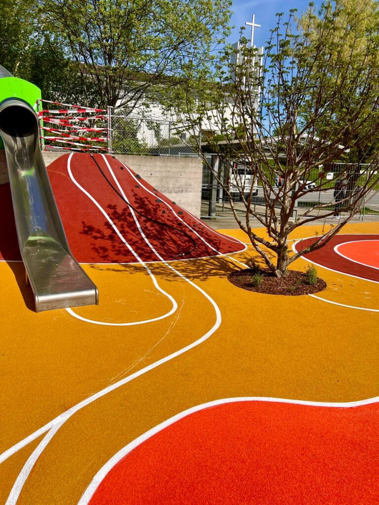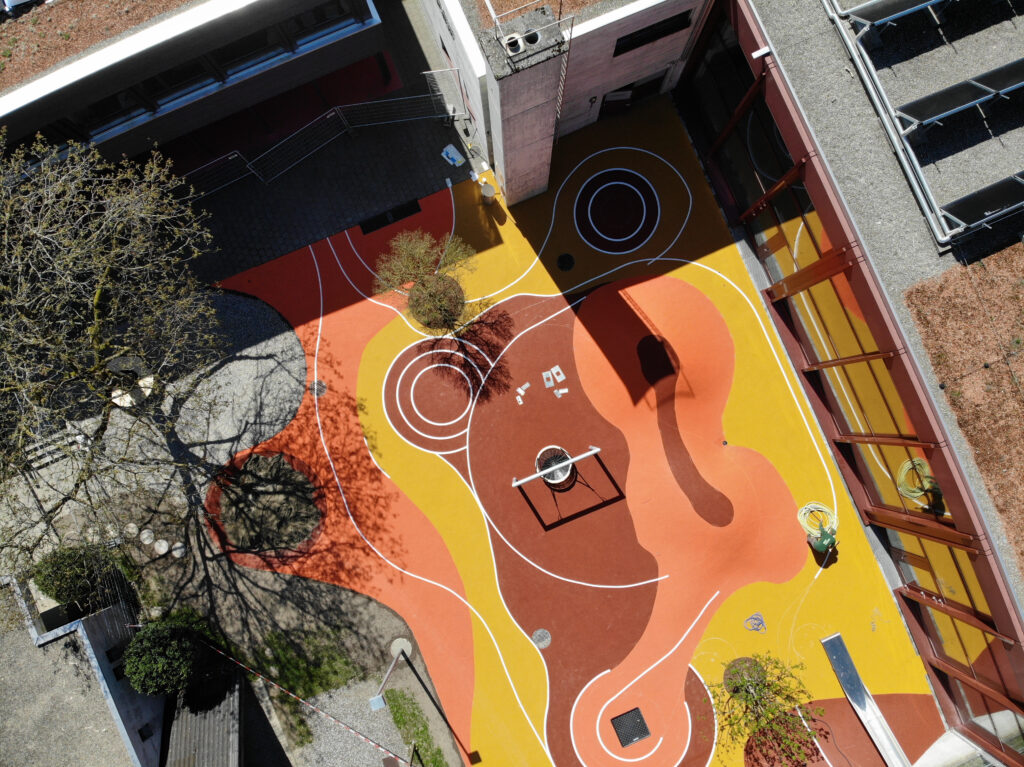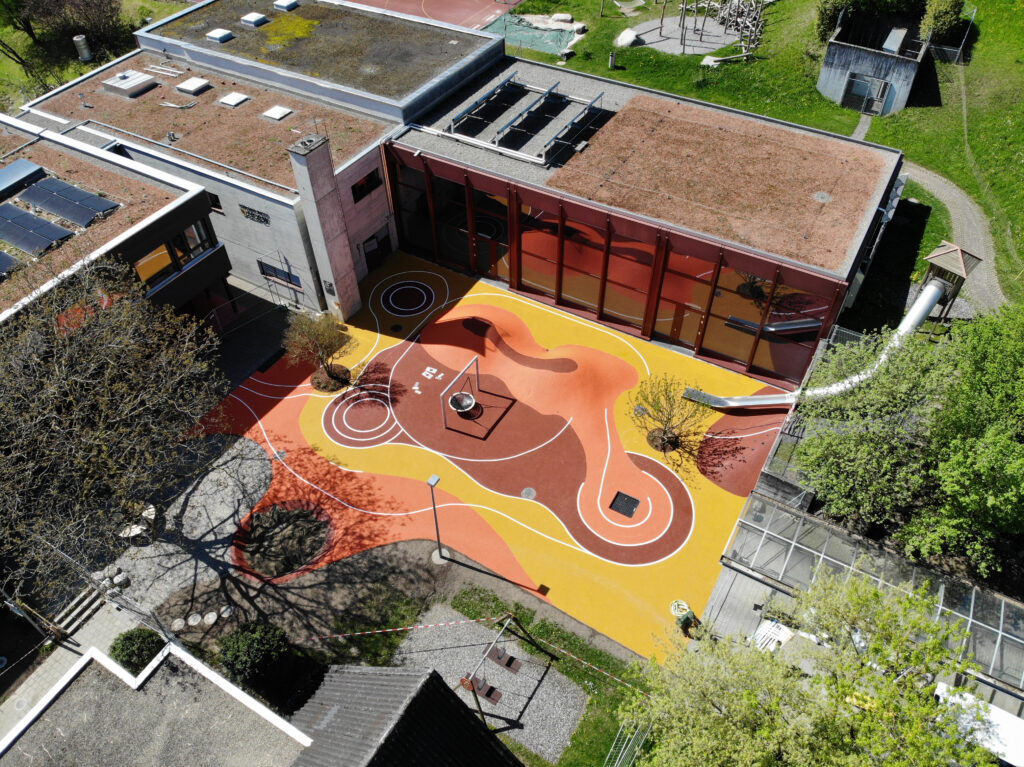 Der Pausenplatz des Schulhaus Mattli in Kastanienbaum, Horw, wurde einer umfassenden Neugestaltung unterzogen, wobei der Fokus auf vielseitigen und innovativen Lösungen lag. Die vorherige Schnitzelgrube und die Holzspielgeräte wurden entfernt, um Platz für einen modernen EPDM-Belag in verschiedenen Farben zu schaffen. Dieser Belag dient nicht nur als wetterbeständige, fallsichere, sickerfähige und verschleißarme Oberfläche, sondern fungiert auch als zentrales Gestaltungselement des neuen Pausenplatzes.