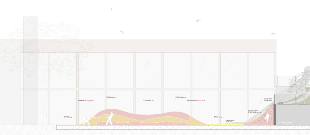 Ein herausragendes Merkmal des neuen Designs ist die Modellierung des Belags, wobei die verschiedenen Farben eine besondere Betonung erhalten. Der Pausenplatz erhebt und senkt sich zu Hügeln und Mulden, windet sich an Mauern empor und schafft so neue räumliche Qualitäten.