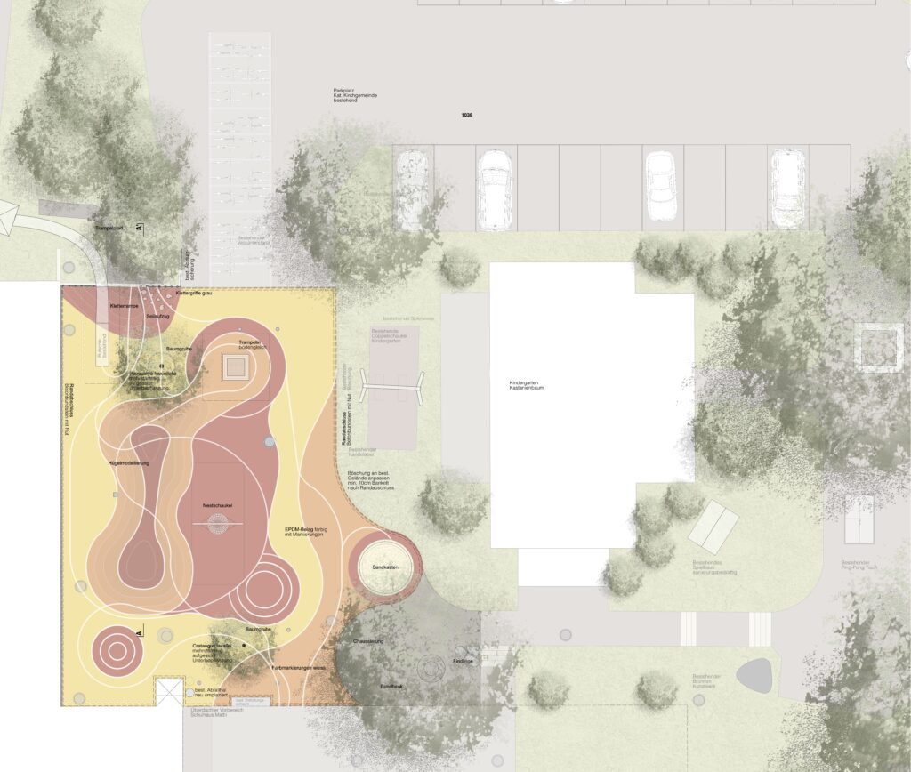 Gegenüber dem bestehenden Kindergartengebäude wurde eine sanfte Geländeanpassung vorgenommen, um eine Verbindung zwischen dem Pausenplatz und dem angrenzenden Kindergarten herzustellen, wobei die bestehende Feuerwehrzufahrt erhalten blieb.