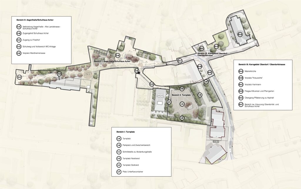 Die Gemeinde Unterägeri hat mit der Einleitung des Studienauftragsverfahrens zur Zentrumsgestaltung Oberdorf einen vorausschauenden und strategisch bedeutenden Schritt unternommen. Ziel ist es, dem zentralen Bedürfnis nach einer qualitativ hochwertigen, funktionalen und identitätsstiftenden Ortsmitte Rechnung zu tragen. Die ausgewählten Zonen – insbesondere der Alte Turnplatz, die Oberdorfstrasse, das Kerngebiet Oberdorf, der Zugangshof zum Schulareal Acher sowie der Umgebungsbereich der Aegerihalle – bieten durch ihre Lage im historisch gewachsenen Ortskern ein grosses städtebauliches Potenzial für eine neue Mitte mit hoher Aufenthaltsqualität.