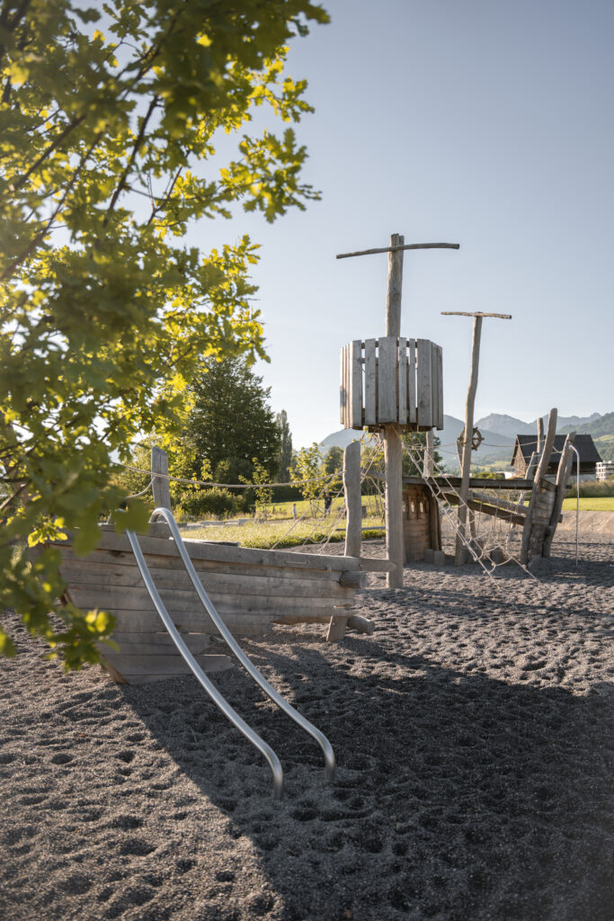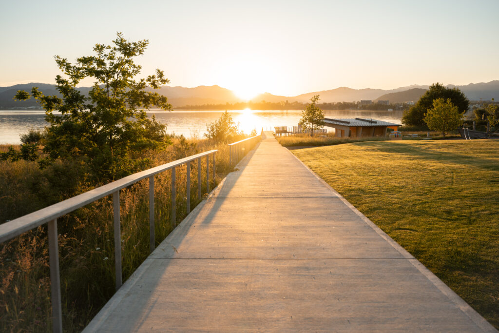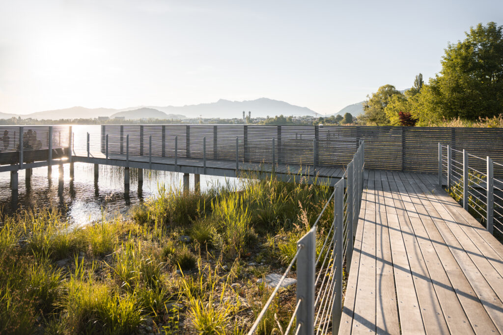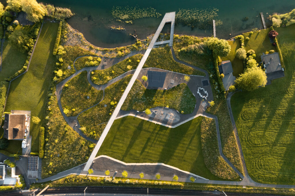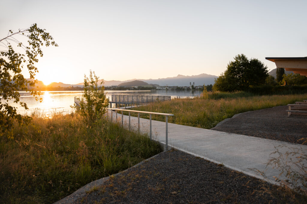 Eine starke Diagonale führt direkt vom Bahnweg auf den Obersee hinaus. Diese klare Rampe spiegelt den Wunsch des Besuchers wieder, die Nähe des Wassers zu erleben. Die Verbindungsrampe teilt den Park klar in zwei Teile; nutzungsintensive und dorforientiert der eine, naturnah und zum See hin geöffnet der andere.