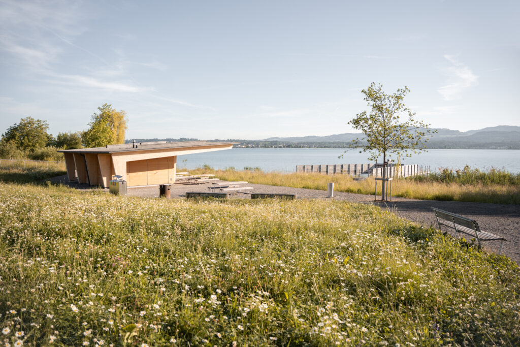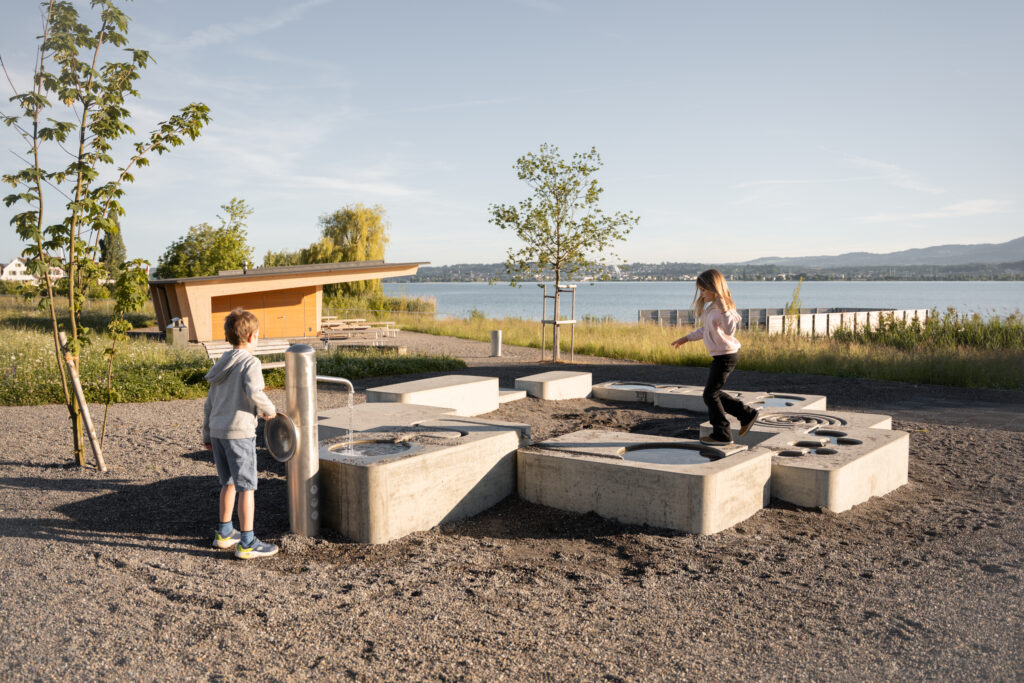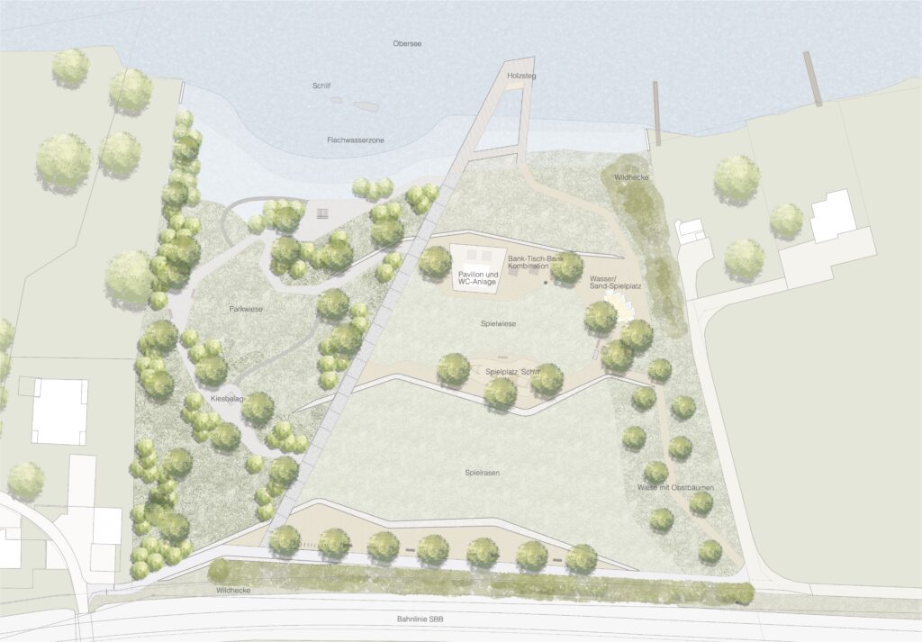 Kinderspiel, kontemplativer Aufenthalt, sportliche Betätigung, soziale Begegnung und temporäre Anlässe finden im östlichen, intensiven Parkteil statt. Der Park ist wandelbar und erweiterbar und wächst mit der Gemeinde und den Nutzern mit. Auf eine Badenutzung ist bewusst verzichtet worden um keine Konkurrenzsituation zu den bestehenden Badeanstalten am See zu generieren und die naturnahe . Eine Erstausstattung mit dem zentralen Wegnetz, dem Steg, einer Spielanlage, Sitzgelegenheiten und den sanitären Anlagen, lassen diesen neuen Ort des Erlebnisses und der Begegnung organisieren und funktionieren. Die weitere Entwicklung des Parks am See geschieht im Wesentlichen adaptiv.