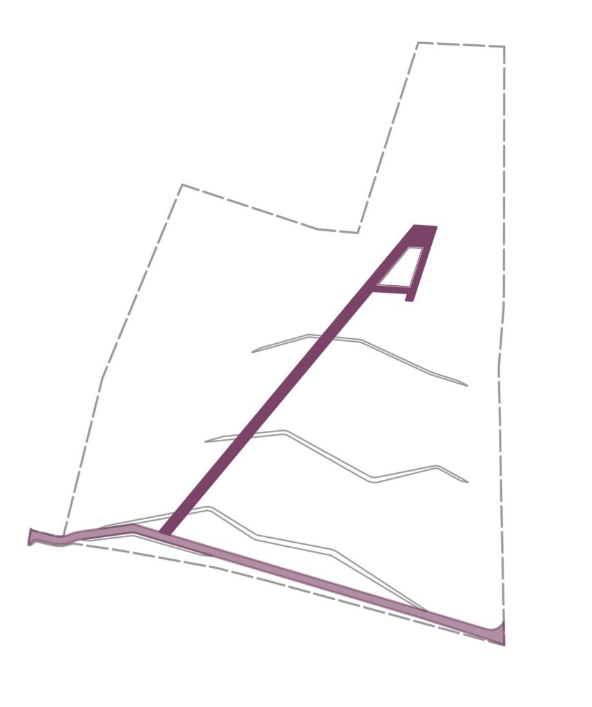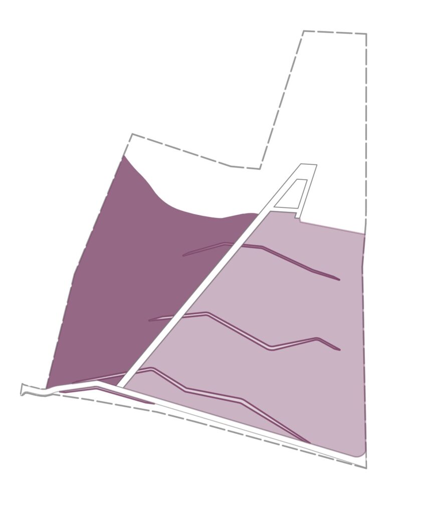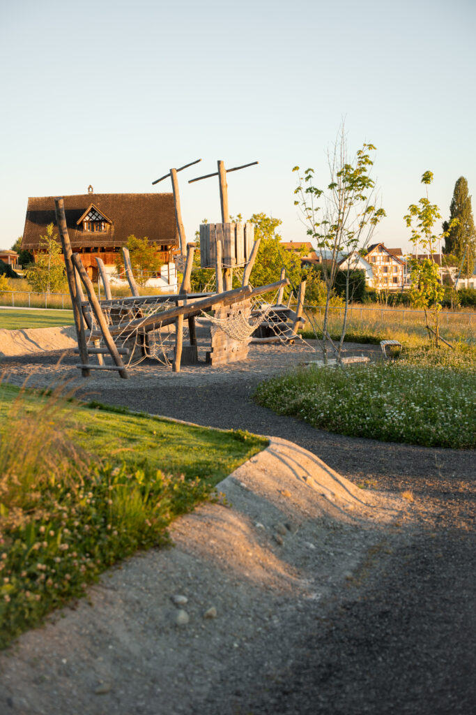 Die Transformation der bis heute landwirtschaftlich genutzten Wiese in einen vielfältig nutzbaren Park erforderte eine Strukturierung und Modellierung der künftigen Parkfläche. Über eine sanfte, wellenförmige Terrassierung, die an Uferabbrüche erinnert, wurde der Höhenunterschied überbrückt und die intensivere Nutzung erst ermöglicht.