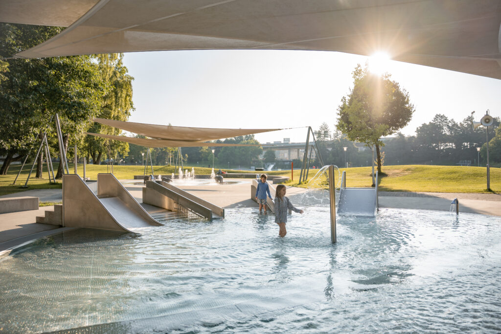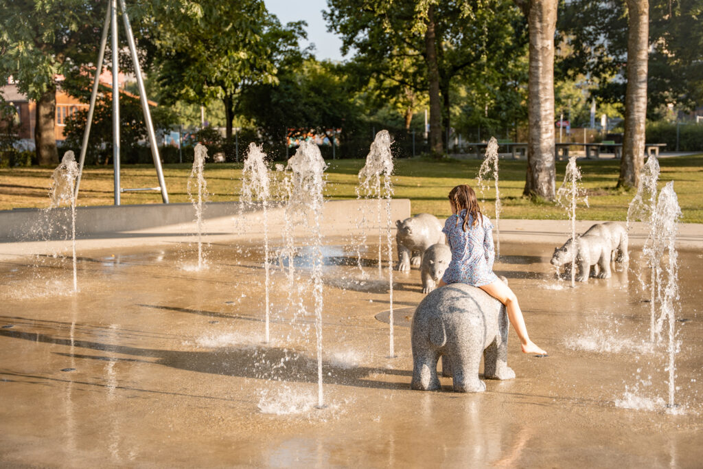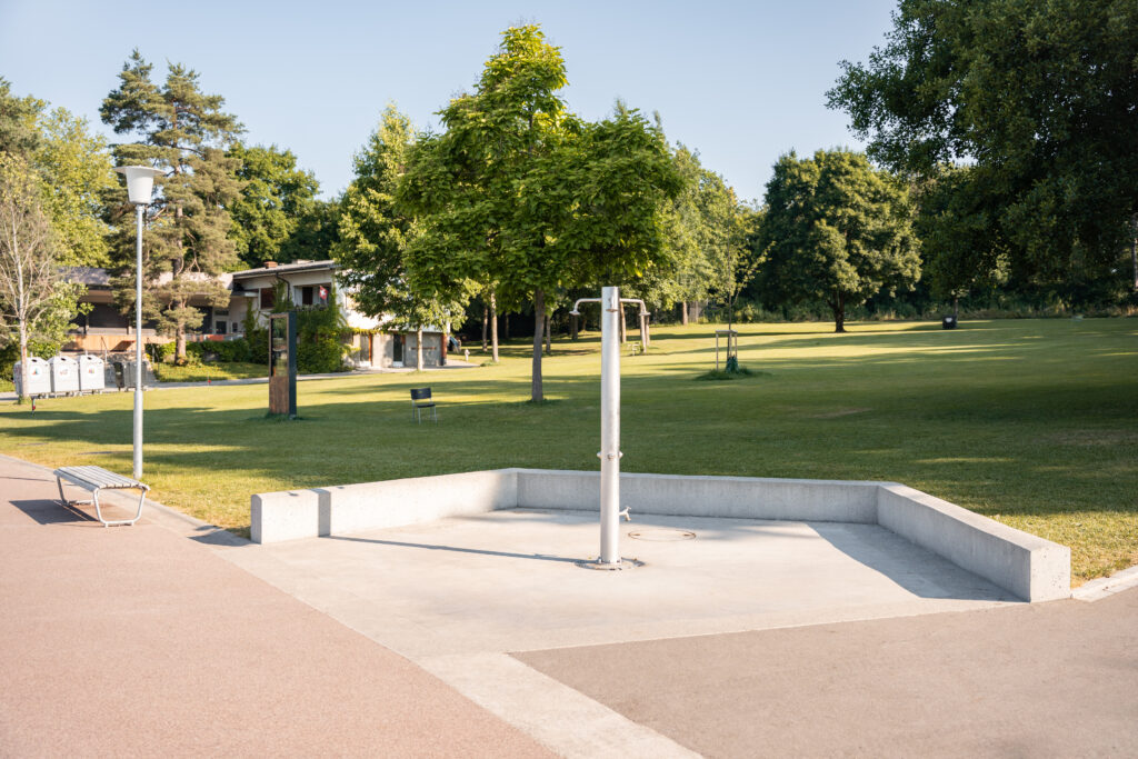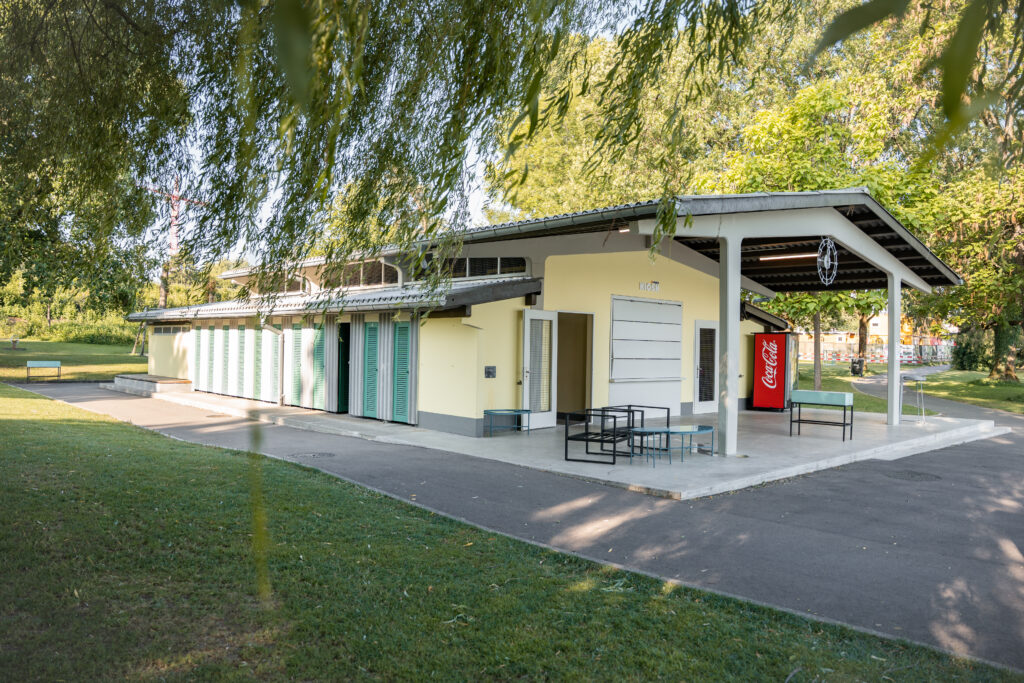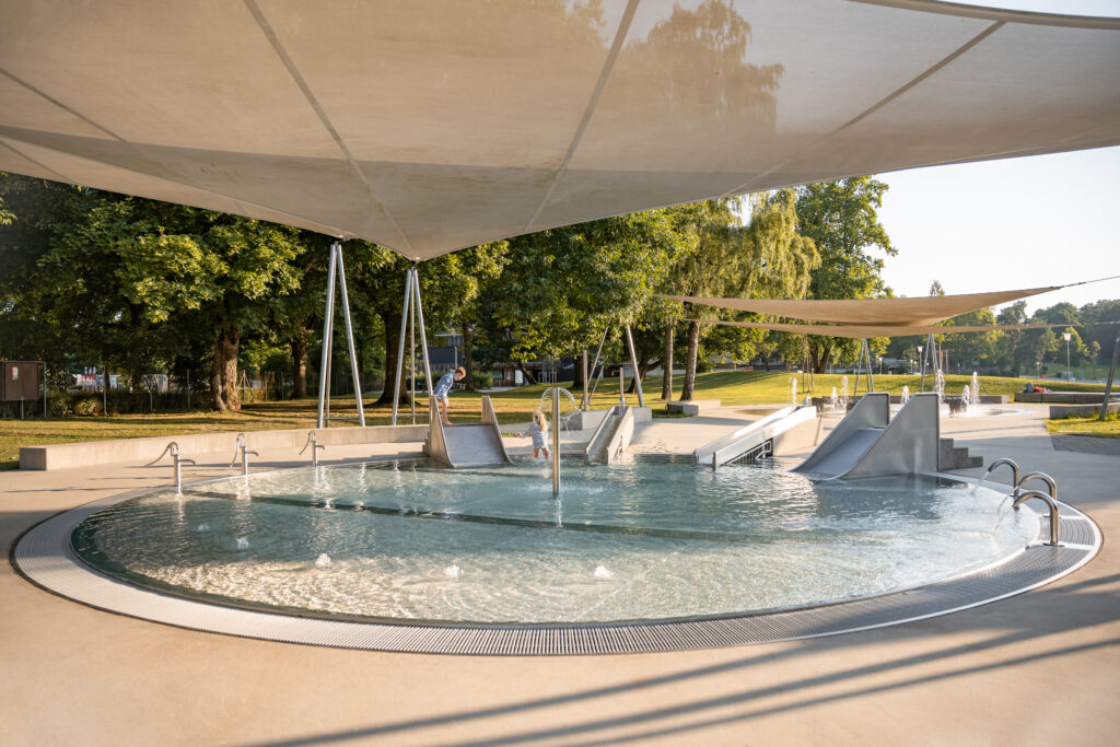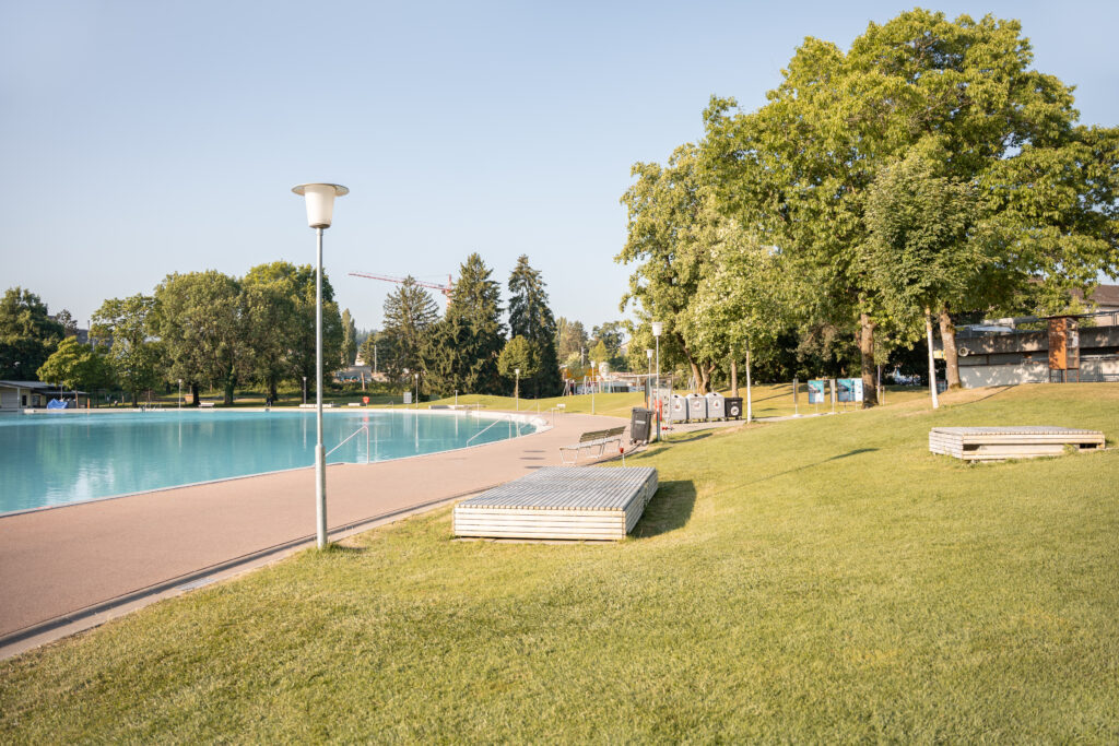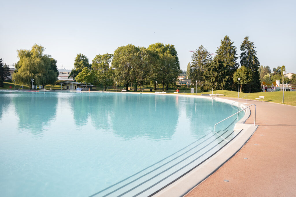 Innerhalb der Park- und Badeanlage wurde der Wasserspielplatz aufgehoben und eines der zwei bestehenden Planschbecken rückgebaut. An dieser Stelle befindet sich nun ein mit Bodendüsen ausgestatteter Platz. Im grossen Becken gibt es zudem neuerdings eine Breitrutsche im Nichtschwimmerbereich. Der Sprungturm und die Sprunggrube wurden so belassen, obwohl dies nicht den Empfehlungen der BFU entspricht. Die Bauherrschaft hat diese Tatsache hingenommen und das Sprungbrett ersetzt. Das Becken wurde mit einer Folie abgedichtet, welche am bestehenden Beckenkopf angeschlossen ist.