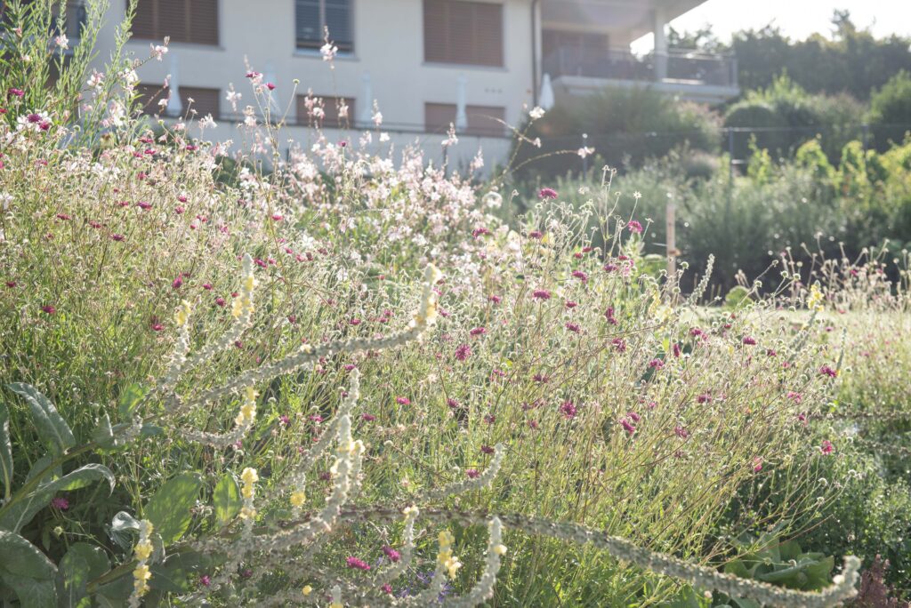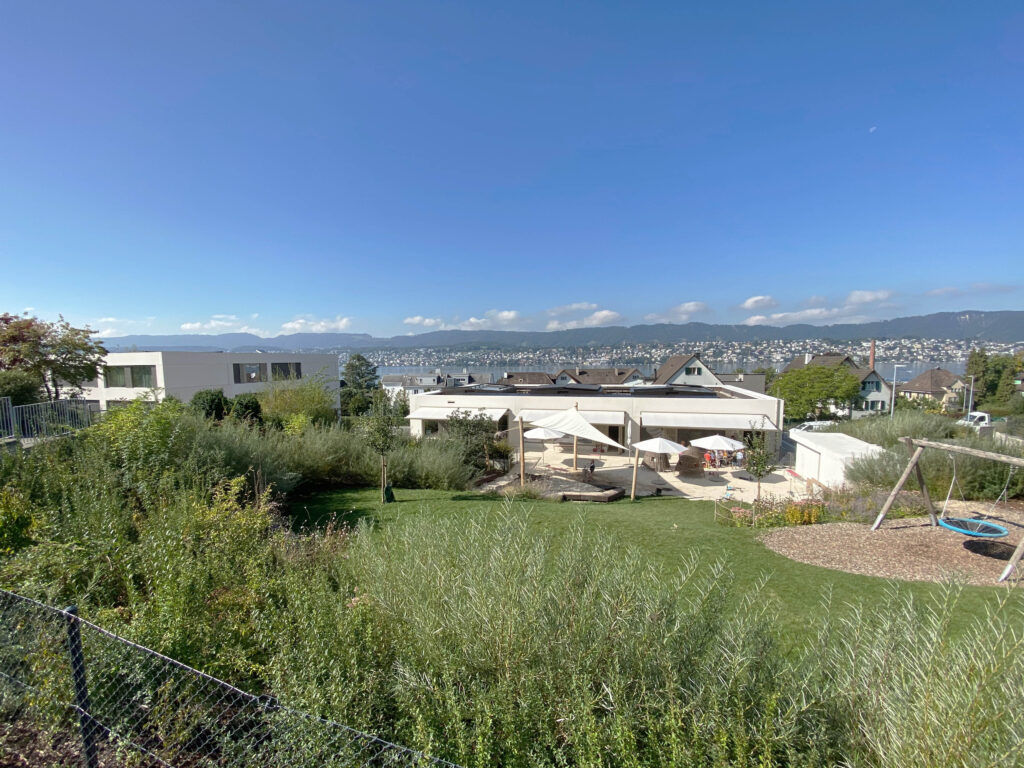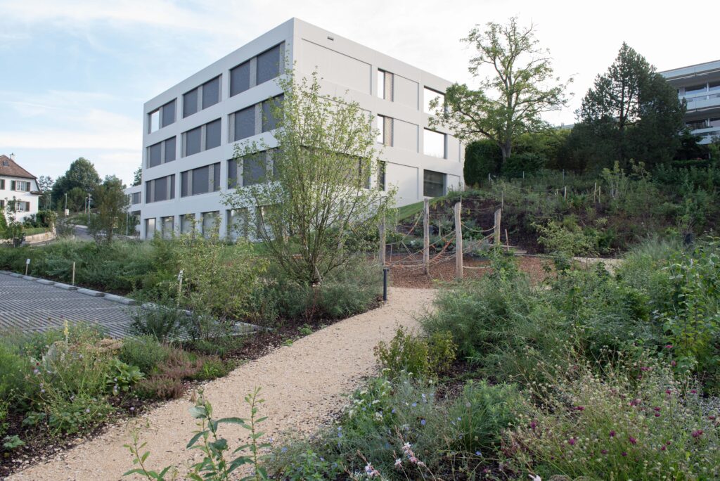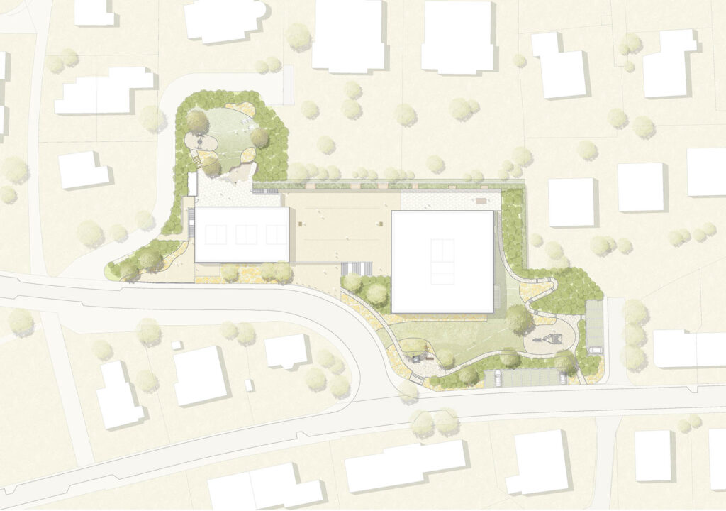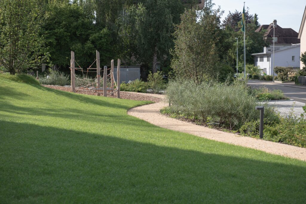 Durch die Setzung von zwei Gebäudekörpern in die Hanglage entstehen drei Aussenräume mit unterschiedlicher Stimmung und Nutzung. Der erhöhte Pausenplatz als Entrée und Aussichtsterrasse, der Spiel- und Aufenthaltsbereich des Kindergartens und ein eher öffentlicher Spielbereich entlang der Zürichstrasse. Die Erschliessung der Gesamtanlage wird aus der Topographie entwickelt und verbindet alle Aussenbereiche miteinander. Die neue Schulumgebung ist im grünen Quartier verankert und nimmt somit charakteristische Merkmale der Nachbarschaft auf. Einheimische Sträucher, in Gruppen gepflanzt, bilden den Rahmen um die Schulanlage. Im Bereich der Aufenthaltsflächen und den Zugängen wird die Bepflanzung mit blühfreudigen Stauden akzentuiert.