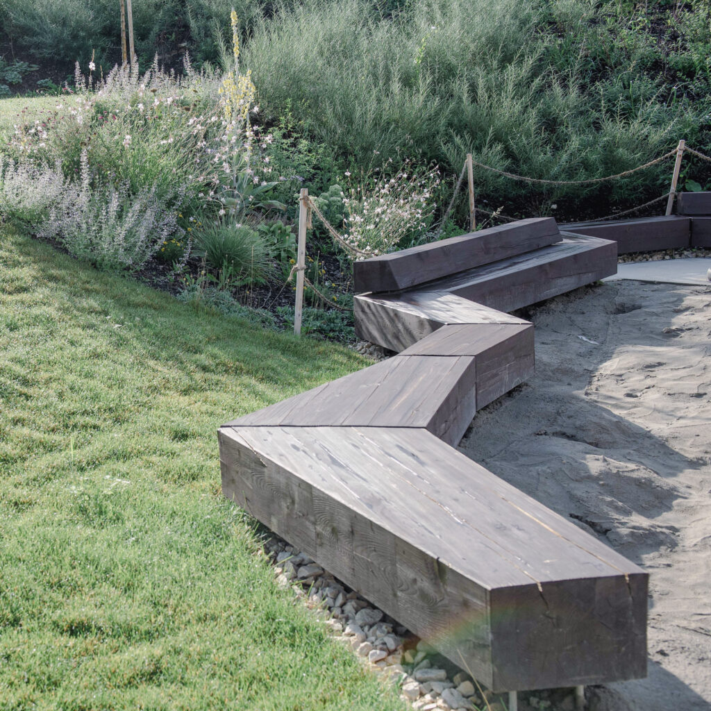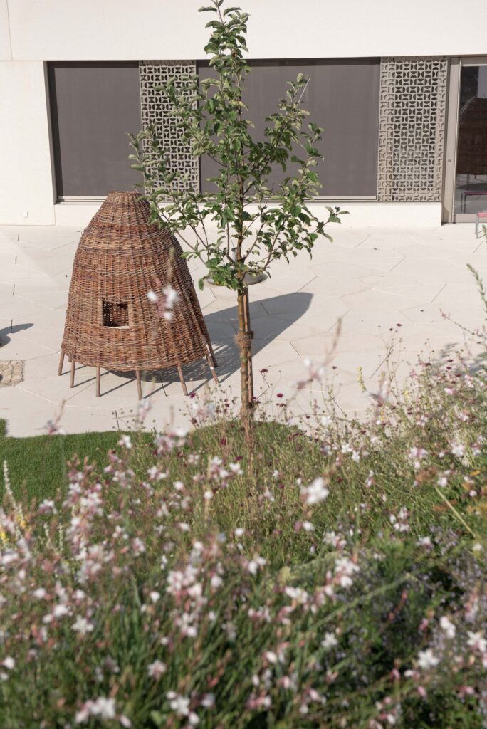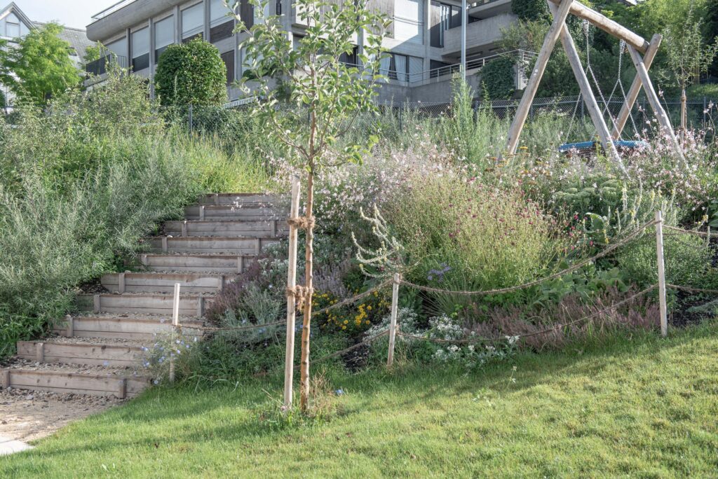 Einzelne einheimische Bäume spenden Schatten und schaffen eine stimmungsvolle Atmosphäre. In der 4 Meter hohen Hecke, die den Pausenplatz bergseitig begrenzt, sind individuelle Spielhäuser integriert.