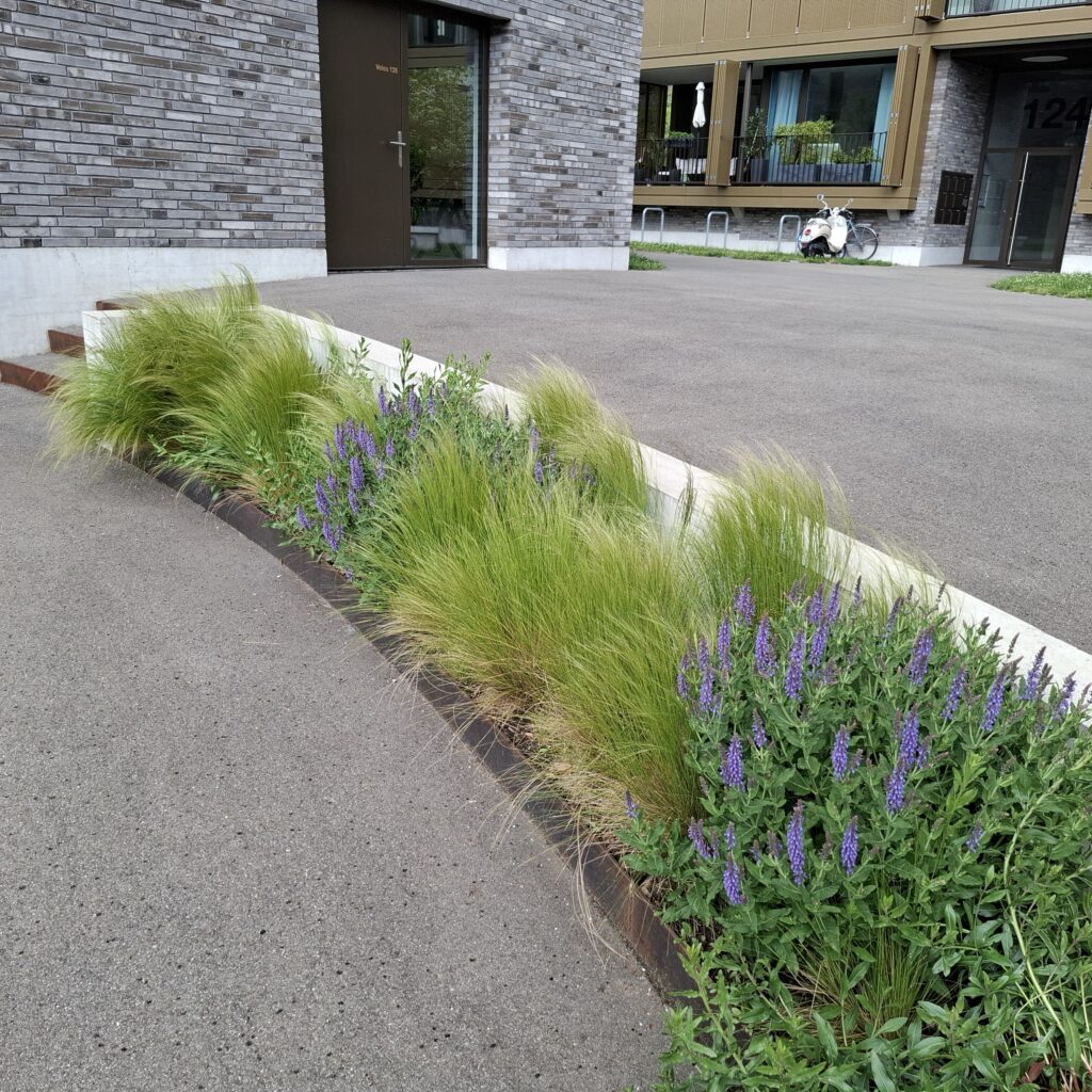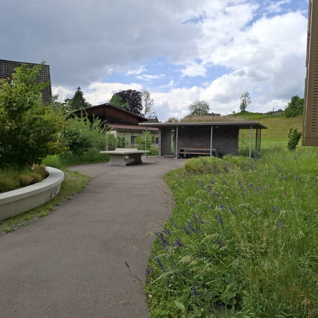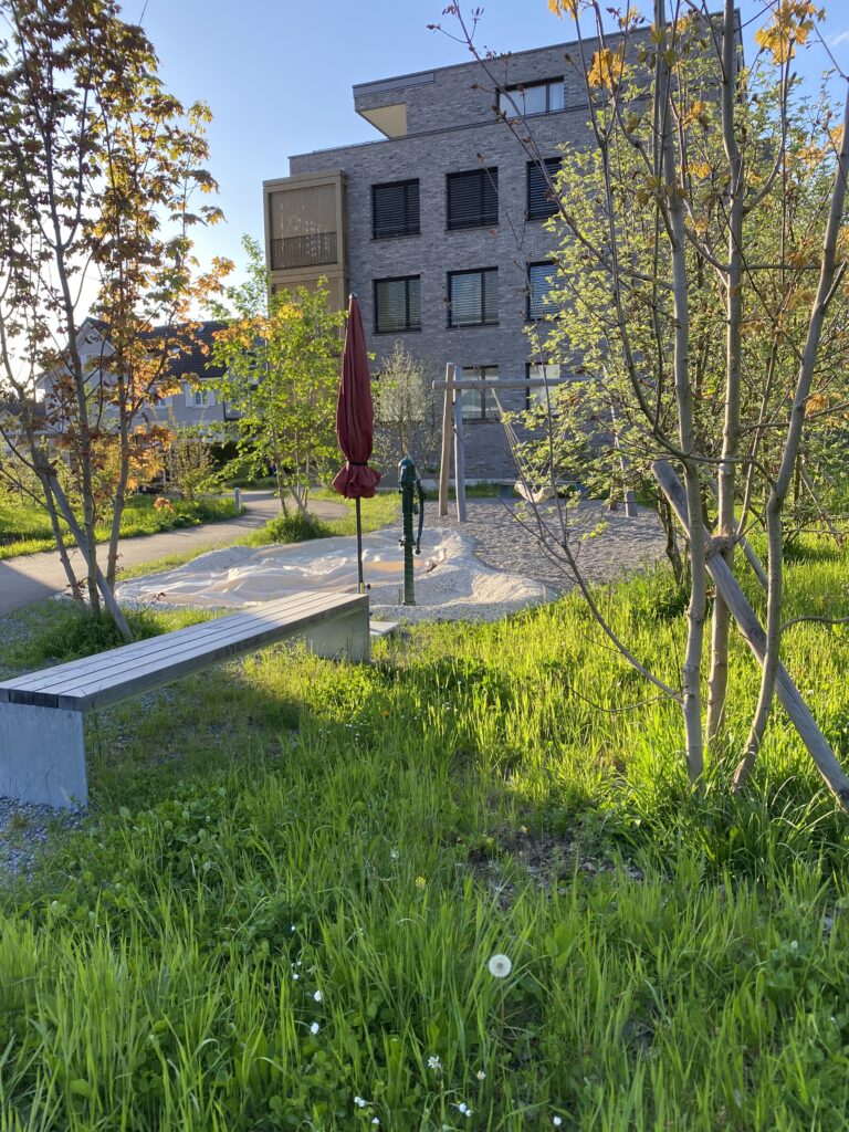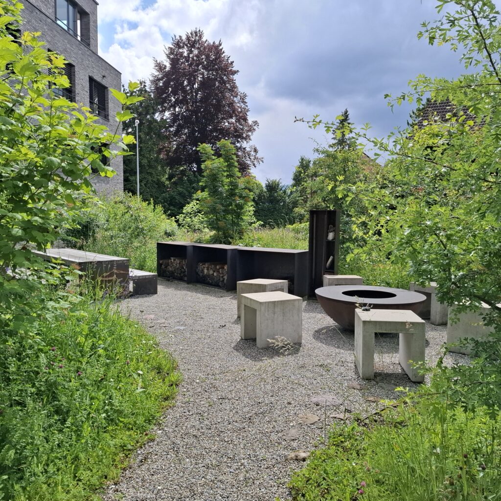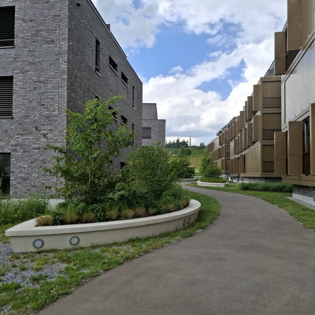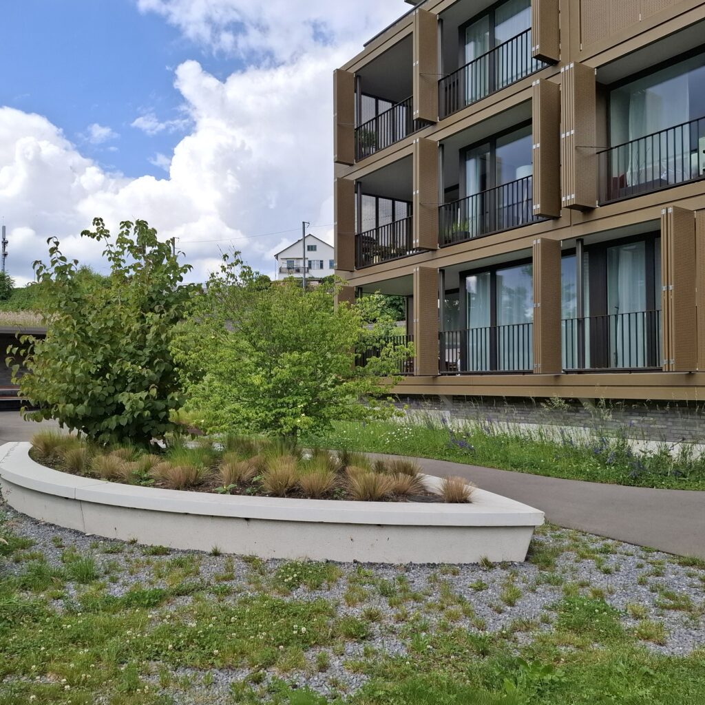 Die Aussenraumgestaltung ist das vermittelnde Element zwischen der Architektur und der unmittelbaren Landschaft. Als Inspiration für die Ausstattungselemente dienten dabei die sich, in den Wellen des Zürichsees, wiegenden Boote. Von einem zentralen Ankunftsplatz verläuft der geschwungene Hauptweg beidseitig zu den gegen den See orientierten Hauseingängen. Die Häuser werden von Wiesen- und Schotterrasenflächen umspült. Der Grünanteil innerhalb der Überbauung ist hoch und durch Pflanzbeete und Pflanzschiffe attraktiviert. Abgesehen vom strassennahen Ankunftsplatz ist die Überbauung verkehrsfrei gehalten, was die Aufenthaltsqualität erheblich steigert. Spielplätze und eine Feuerstelle, die aus historischem Steinmaterial gefertigt wird, strutkurieren den Aussenraum zusätzlich. Es entsteht eine attraktive Überbauung mit Zentrumsnähe und hoher Wohnqualität.